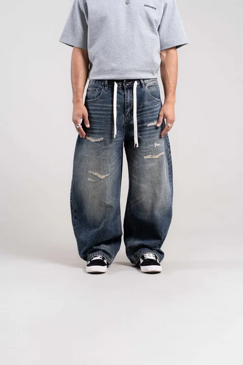 Tela rígida con elástico en cintura parte trasera y cordón con pocas roturas en ambas piernas